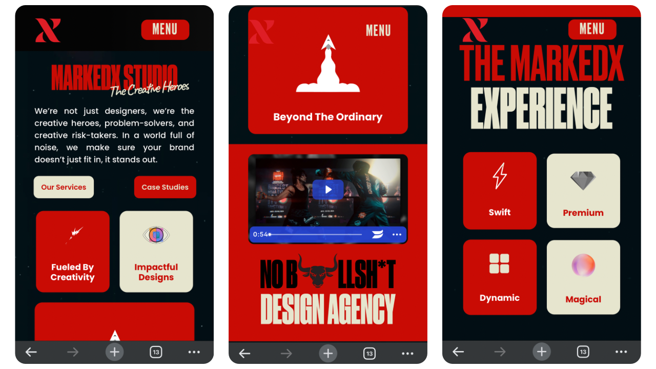 MarkedX Studio establishes itself as a “No Bllsht Design Agency” with a bold mission: to be the “Creative Heroes” for their clients. Operating in a saturated market of digital agencies, they differentiate themselves through a high-energy, confident brand voice that promises to cut through the noise. Their core offerings focus on Branding & Identity, Ads Creative, and Motion Graphics. To support this positioning, they needed a digital presence that wasn’t just a portfolio, but a declaration of their “Swift, Premium, Dynamic, and Magical” service ethos.